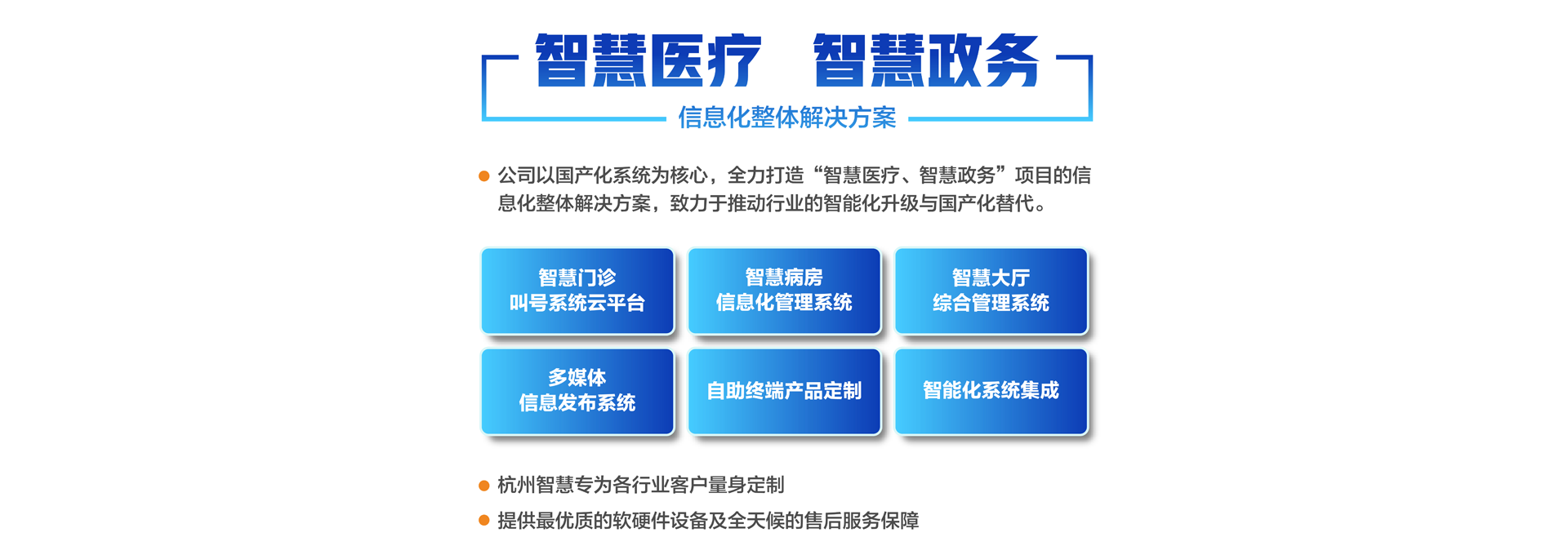 杭州智慧科技有限公司初創(chuàng)于2003年,總部位于重要的電子商務(wù)中心中國杭州公司主營業(yè)務(wù)有:智慧分診叫號系統(tǒng)、智慧病房醫(yī)護(hù)對講系統(tǒng)、智慧大廳綜合管理系統(tǒng)、智慧政務(wù)管理系統(tǒng)、智慧多媒體信息發(fā)布系統(tǒng)、導(dǎo)診系統(tǒng)及各自助終端產(chǎn)品定制。專為各行業(yè)客戶量身定制。公司已有20余年行業(yè)經(jīng)驗沉淀積累,擁有優(yōu)秀的產(chǎn)品外觀設(shè)計師和各類中高級專業(yè)技術(shù)工程師,確保所研發(fā)的產(chǎn)品具有行業(yè)領(lǐng)先的外觀及可靠的技術(shù)性能。并擁有權(quán)威部門頒發(fā)的各類知識產(chǎn)權(quán)及專利證書,30多項資質(zhì)證書、800多個合作伙伴、2000多個項目成功案例經(jīng)驗。 智慧產(chǎn)品已遍及全國各醫(yī)療、政務(wù)、金融、通訊、公安、工商、稅務(wù)等行業(yè),形成以“立足杭州、輻射長三角、拓展全國”的戰(zhàn)略發(fā)展格局,產(chǎn)品經(jīng)過歷年不斷創(chuàng)新,形成專業(yè)化、平臺化,致力于成為智慧產(chǎn)品的領(lǐng)軍企業(yè)。 公司建立了完善的技術(shù)培訓(xùn)及售后服務(wù)中心,并設(shè)24小時熱線咨詢電話解答用戶反饋的問題。同時應(yīng)客戶要求定期派技術(shù)人員到 全國各地進(jìn)行技術(shù)指導(dǎo)輔助用戶正確使用智慧產(chǎn)品并能獨立安裝、調(diào)試、日常維護(hù)等工作。提供最優(yōu)質(zhì)的設(shè)備及全天候的售后服務(wù)保障,智慧永恒不變的服務(wù)宗旨——致力于客戶的滿意與成功!...